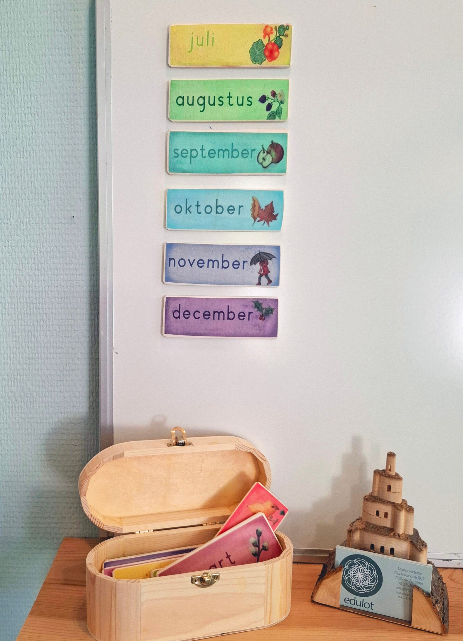 Deze prachtige set van FSC populieren hout uit eigen land geeft de 12 maanden weer. Er zitten magneten achter zodat ze op alle whiteboarden en schoolborden te gebruiken zijn. Ideaal voor in de klas.